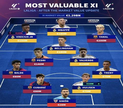 近日,德國轉會市場更新西甲球員身價并發(fā)布“最有價值11人”:全隊總身價達12.9億歐元。鋒線由亞馬爾—姆巴佩—維尼修斯領銜,中場有貝林厄姆坐鎮(zhèn);后場庫巴爾西與胡伊森、阿諾德等入選,維尼修斯則小幅下調2000萬歐元。接下來我們將圍繞“名不副實”與“物有所值”兩條主線,結合即戰(zhàn)力、健康穩(wěn)定性、樣本量與位置稀缺度進行評估。