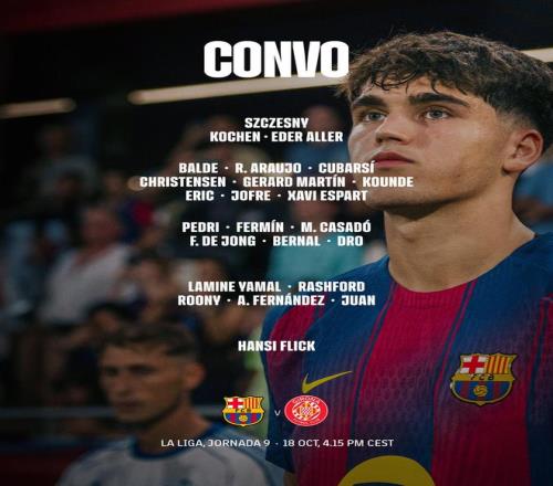 雷速體育10月18報(bào)道 巴塞羅那俱樂(lè)部官方公布了本輪西甲主場(chǎng)對(duì)陣赫羅納的球員名單,亞馬爾和費(fèi)爾明榜上有名、復(fù)出在即。
