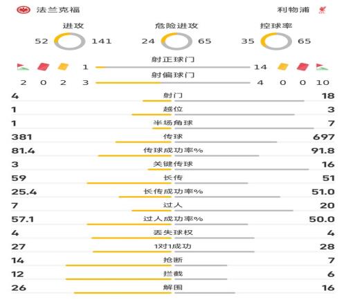 因為法蘭克福在全場比賽里,處于被動挨打的境地,這也令球隊在防守數(shù)據(jù)方面占優(yōu),在搶斷(14-7)、攔截(12-6)和解圍(26-16)等數(shù)據(jù)方面,皆全面優(yōu)于利物浦。