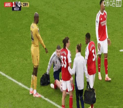 第69分鐘,加布里埃爾爭搶頭球,隨后撞到立柱痛苦倒地。