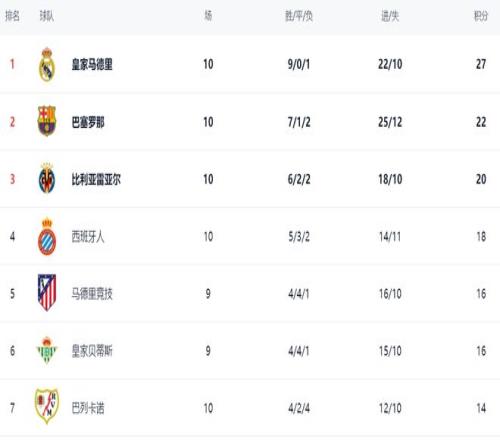 皇馬擊敗巴薩改變了爭冠格局。在積分榜上,皇馬擴大了領(lǐng)先優(yōu)勢,27分領(lǐng)跑,領(lǐng)先第2名的巴薩5分,占據(jù)了奪冠主動權(quán)。比利亞雷亞爾以20分排名第3。第4的是西班牙人,拿到18分。馬競4勝4平1負(fù),只拿到16分,排名第5?;始邑惖偎挂彩?6個積分,排名第6。